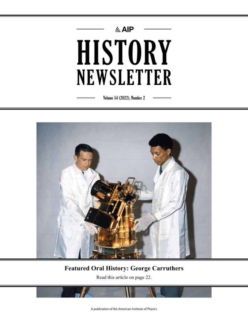- Corinne Mona and Joanna Behrman. “Featured Oral History: George Carruthers.” American Institute of Physics History Newsletter 54, no. 2 (Fall 2022), 22-24. https://www.aip.org/sites/default/files/2022-12/v54n2_2022-singles.pdf